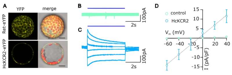 HcKCR2 在植物細(xì)胞中起作用 A. 表達(dá) eYFP 標(biāo)記的 HcKCR2 或?qū)φ?(Ret-eYFP) 的本氏奈瑟菌原生質(zhì)體的共聚焦圖像,在瞬時(shí)轉(zhuǎn)化后 48 小時(shí)捕獲。B-C.用對(duì)照構(gòu)建體(B)或HcKCR2(C)轉(zhuǎn)化的本氏奈瑟菌原生質(zhì)體的膜片鉗實(shí)驗(yàn)中記錄的全細(xì)胞電流。將細(xì)胞保持在 -60 mV 的保持電位,并以 40 至 -60 mV 的步長進(jìn)行測試,遞減 20 mV,持續(xù) 8 秒。5 s BL 脈沖 (λ = 490 nm, 5 mW/mm2)施加在每個(gè)電壓階躍上。D.對(duì)照和HcKCR2表達(dá)原生質(zhì)體的I-V關(guān)系。圖片來源:科學(xué)(2023 年)。DOI: 10.1126/science.adj9696