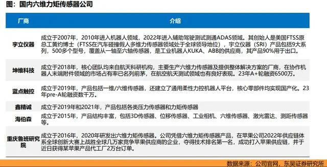 六維力矩傳感器壁壘較高,國產(chǎn)六維力矩傳感器與外資主流傳感器仍存在差距。從競爭格局看,美國的ATI產(chǎn)品類型多,性能良好,為Kuka、ABB、安川等協(xié)作機器人廠商提供核心產(chǎn)品;德國的HBM、ME,均可自產(chǎn)應(yīng)變片;瑞士Kistler是電壓式的佼佼者。國產(chǎn)廠商中,宇立儀器、坤維科技、鑫精誠、海伯森、藍(lán)點觸控、神源生智能、瑞爾特測控等已有相關(guān)的產(chǎn)品落地并進入產(chǎn)業(yè)化應(yīng)用,新進入者東華測試、昊志機電、埃力智能等已初步具備六維力矩傳感器的生產(chǎn)能力,部分產(chǎn)品已開始送樣測試。不過,曾朵紅等人表示,六維傳感器的壁壘更多在于工藝,無明顯卡脖子環(huán)節(jié),中國廠商在中低端產(chǎn)品上已突破,且產(chǎn)品性價比高,且更多資本進入該領(lǐng)域加速技術(shù)迭代,中國廠商優(yōu)勢明顯。