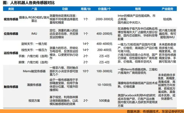 東吳證券曾朵紅在2月26日的研報中表示,人形機器人包括感知模塊、交互模塊、運控模塊,其中感知模塊類似于人類的各類感官神經(jīng),提供視覺、位覺、 觸覺、力覺等信息,分布于人形機器人的各類關(guān)節(jié)中,提供運控規(guī)劃準(zhǔn)確性,是人形機器人具身智能的基礎(chǔ)。隨著人形機器人未來有更準(zhǔn)確的感知和更有效的交互,感知模塊成長空間廣闊。