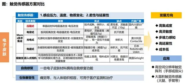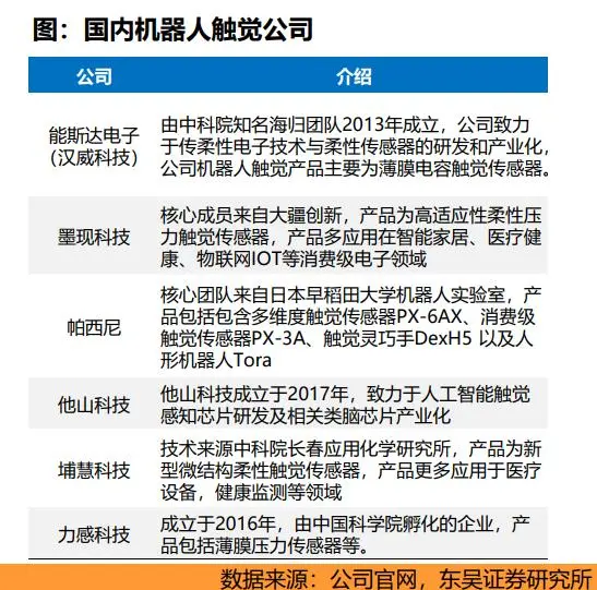 目前機器人觸覺傳感器市場主要由美國企業(yè)占據(jù)。根據(jù)QY Research,2022年全球前五大廠商占據(jù)76%份額,分別為美國Tekscan、Pressure Profile Systems、Sensor Products、德國Weiss Robotics、美國Syn Touch。國內(nèi)企業(yè)規(guī)模尚小,其中漢威科技子公司能斯達(dá)主要生產(chǎn)薄膜電容觸覺傳感器,可應(yīng)用于機器人身體,產(chǎn)品成熟;初創(chuàng)型公司帕西尼致力于用列陣式柔性觸覺傳感器應(yīng)用于機器人領(lǐng)域,技術(shù)積累相對扎實;此外墨現(xiàn)科技、他山科技、埔慧科技、力感科技也有相關(guān)布局。