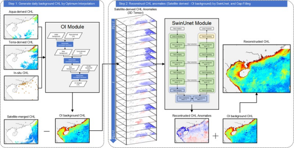 該研究結(jié)合最優(yōu)插值(OI)方法和深度學(xué)習(xí)網(wǎng)絡(luò)框架(SwinUnet),構(gòu)建了基于數(shù)據(jù)異常預(yù)期方差的深度學(xué)習(xí)模型——OI-SwinUnet。該方法利用最優(yōu)插值,基于空間鄰域信息,融合衛(wèi)星觀測和現(xiàn)場觀測數(shù)據(jù),并利用SwinUnet對大區(qū)域長時序的遙感觀測時間序列數(shù)據(jù)進(jìn)行多尺度特征學(xué)習(xí),重建缺失的葉綠素a濃度數(shù)據(jù),進(jìn)而獲得南海區(qū)域逐日1km海表葉綠素產(chǎn)品。