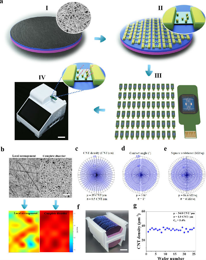 團(tuán)隊逐點解決CNT材料制備、生物傳感器制造、芯片封裝和信號讀取等技術(shù)難點,打造CNT FET生物傳感器的完整鏈技術(shù),并為其在POCT領(lǐng)域的應(yīng)用開發(fā)堅實的技術(shù)基礎(chǔ)。具體而言,在材料制備上,通過改進(jìn)的浸漬涂層技術(shù)制備了高質(zhì)量和均勻性的隨機(jī)取向半導(dǎo)體CNT薄膜(圖1)。