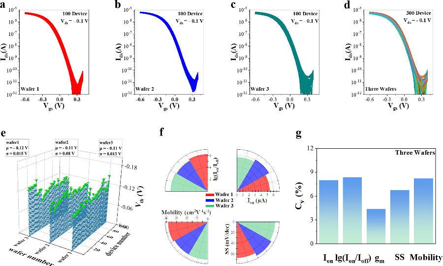 在器件制備上,通過優(yōu)化CNT FET生物傳感器的制備工藝,實現(xiàn)了4英寸晶圓碳基FET批量制備,并大幅度提升了器件均勻性,晶圓內(nèi)器件性能變化系數(shù)優(yōu)于6%,晶圓間器件性能變化系數(shù)在9%以內(nèi)(圖2、圖3)。
