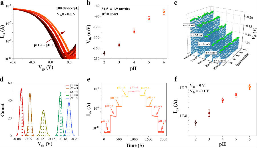 課題組進(jìn)一步驗證了基于CNT FET的離子傳感器的可重復(fù)性,在每個固定的離子濃度下,所測試的傳感器(100個)閾值電壓的標(biāo)準(zhǔn)偏差在5.1 mV以內(nèi),這意味能夠通過直接測試傳感器的漏極電流來讀取待測溶液的離子濃度信息(圖4)。