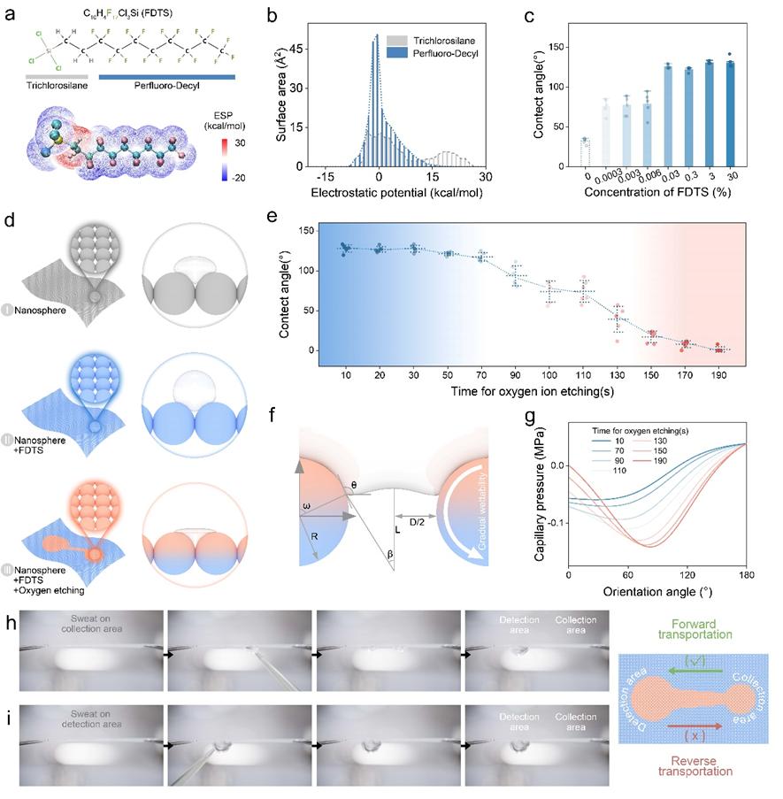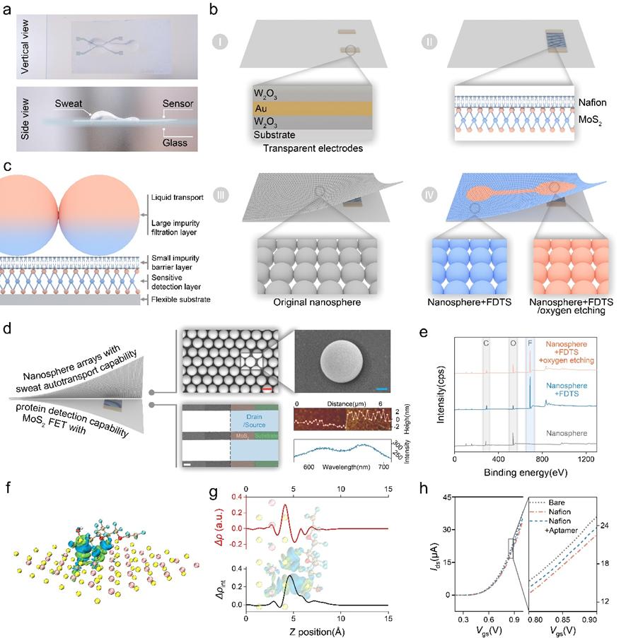 該NM-FET檢測系統(tǒng)主要由兩部分組成:具有逐步潤濕性表面的納米陣列和經(jīng)Nafion/適配體修飾的場效應(yīng)管。納米陣列由直徑為1μm的聚苯乙烯微球組成。經(jīng)全氟葵基三氯硅烷(FDTS)處理和氧離子刻蝕后,納米陣列表面形成親/疏水區(qū)域。納米陣列表面不同區(qū)域的潤濕性變化能夠讓汗液在測試地點實現(xiàn)自動收集和運輸。此外,二硫化鉬場效應(yīng)管部分通過在MoS2材料表面上使用Nafion作為適配體的依附位點進行修飾,使得場效應(yīng)管具有可回收性。同時NM-FET的超薄、超柔性基底,能夠承受一定程度的彎曲變形。NM-FET檢測系統(tǒng)通過自動汗液收集/過濾以及真實汗液中痕量蛋白的高靈敏度檢測,可實現(xiàn)對人體免疫狀態(tài)變化的實時監(jiān)測。