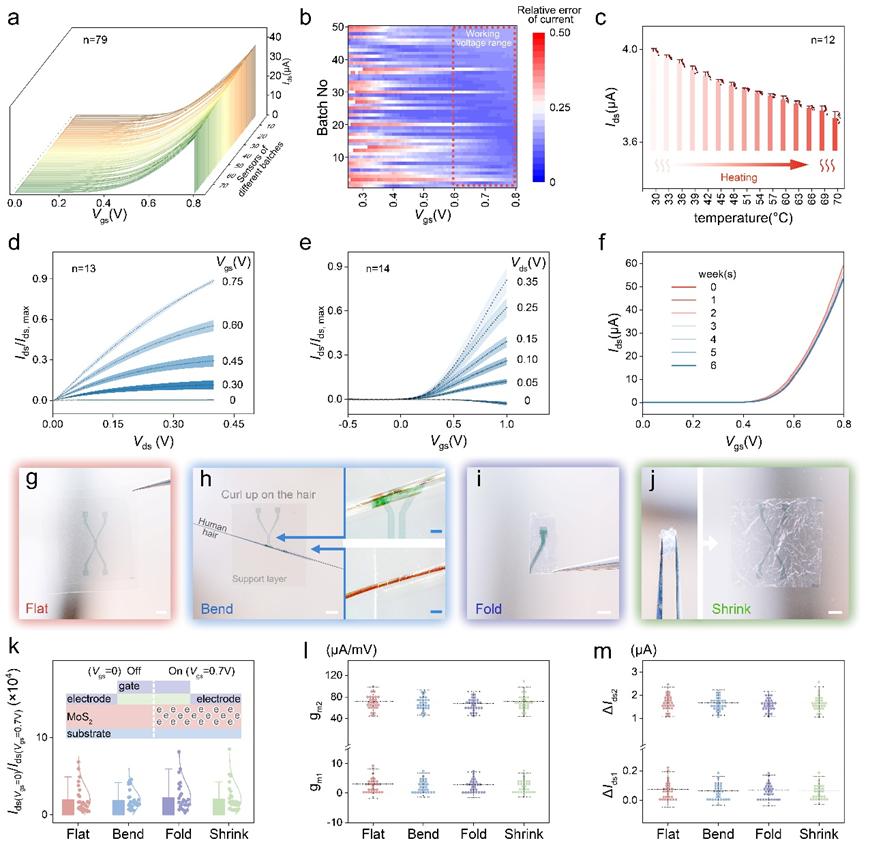 為了評估不同批次NM-FET的性能穩(wěn)定性,測試多個批次場效應(yīng)管傳感器的轉(zhuǎn)移特性曲線,發(fā)現(xiàn)其顯示出較為良好的一致性。為驗證人體溫度變化對NM-FET的影響,場效應(yīng)管測試了溫度范圍30°-70°的電學(xué)性能,其轉(zhuǎn)移特性曲線的電流只從3.99 μA降低到3.7 μA。NM-FET在室溫非密封條件下存儲六周,每周測試NM-FET的轉(zhuǎn)移特性曲線,其電流變化率僅為4.42%。以上結(jié)果說明制造批次,溫度以及長時間存儲對NM-FET系統(tǒng)的電學(xué)性能影響較小。為了驗證NM-FET柔性基底的抗形變能力,利用彎曲、折疊和皺縮來測試每次變形后NM-FET的電學(xué)特性變化,結(jié)果表明NM-FET在經(jīng)歷形變后仍能保持較高的電學(xué)穩(wěn)定性。