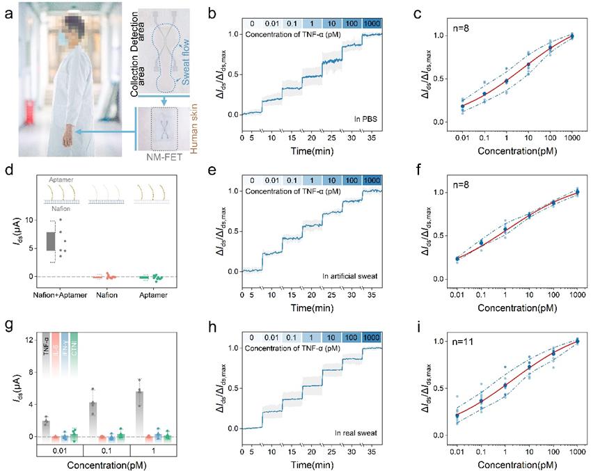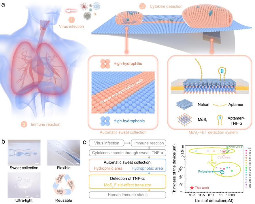細胞因子是協(xié)調(diào)人體免疫反應(yīng)的關(guān)鍵蛋白,廣泛存在于血液和組織液等內(nèi)分泌液以及唾液和汗液等外分泌液中,是臨床評估患者健康狀況的重要生物標志物。在呼吸系統(tǒng)疾病中,病毒通過呼吸道進入人體后,免疫系統(tǒng)分泌各種調(diào)節(jié)炎癥的細胞因子,能夠刺激、集中和擴增免疫細胞。TNF-α作為一種典型的促炎類型細胞因子,在人體的免疫反應(yīng)中尤為重要。通過監(jiān)測汗液中的TNF-α濃度,可以有效地評估機體的免疫狀態(tài)。傳統(tǒng)的檢測方法,例如免疫熒光法和酶聯(lián)免疫吸附法,往往需要復(fù)雜的操作和較長的時間進行檢測,限制了其大規(guī)模應(yīng)用。因此,發(fā)展可穿戴傳感器,實現(xiàn)對于痕量蛋白的檢測,成為新的研究熱點。基于二維材料(如MoS2和石墨烯)的場效應(yīng)晶體管傳感器因其無標記、快速響應(yīng)和高靈敏度等優(yōu)點而備受關(guān)注,在人體代謝物和離子檢測方面得到了初步應(yīng)用。然而,在真實的檢測中,人體外分泌液(如汗液)中雜質(zhì)分子的存在會嚴重干擾痕量蛋白的有效檢測。因此,開發(fā)能夠直接檢測未稀釋汗液中細胞因子的可穿戴設(shè)備成為臨床研究的焦點。