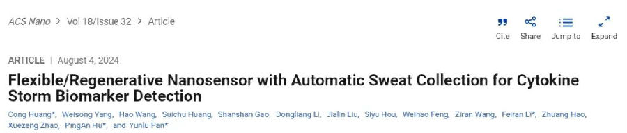 日前,哈爾濱工業(yè)大學(xué)的潘昀路、胡平安教授團隊,設(shè)計開發(fā)了一種具有自動汗液輸送、雜質(zhì)隔離和可重復(fù)使用功能的高靈敏度柔性監(jiān)測系統(tǒng)——納米陣列二硫化鉬場效應(yīng)管(NM-FET)。該系統(tǒng)將具有逐步潤濕性表面的納米陣列和用Nafion/適配體修飾的場效應(yīng)管傳感器進行集成,該系統(tǒng)可檢測真實汗液中10fM~1nM范圍變化的TNF-α蛋白濃度。相關(guān)工作以“Flexible/Regenerative Nanosensor with Automatic Sweat Collection for Cytokine Storm Biomarker Detection”為題發(fā)表在《ACS Nano》,并被選為當期封面。文章共同第一作者為哈爾濱工業(yè)大學(xué)機電工程學(xué)院助理研究員黃聰、2023級博士生楊煒嵩、2021級博士生王昊、2018級博士生黃穗楚。