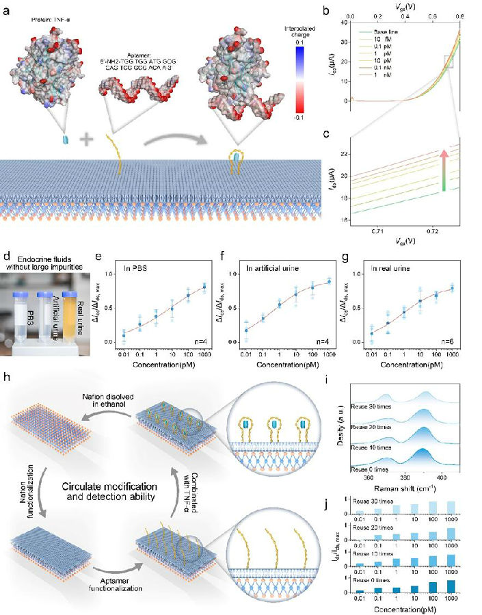 在真實檢測中,人體外分泌液中雜質(zhì)分子的存在會嚴重干擾蛋白的有效檢測。為了證實該檢測系統(tǒng)在不同溶液中的檢測能力,NM-FET分別在磷酸鹽緩沖溶液(PBS)、人工尿液和真實尿液中檢測,均表現(xiàn)出較為出色的檢測能力。適配體和蛋白結(jié)合后通常無法自行分離,因此大多數(shù)基于適配體檢測的傳感器是一次性的。而如果可將傳感區(qū)域進行回收處理,即可實現(xiàn)傳感器的重復(fù)利用。由于Nafion可溶于酒精,將使用過的NM-FET浸入酒精,MoS2通道表面的Nafion溶解,即可恢復(fù)到原始MoS2通道狀態(tài)。隨后使用Nafion和適配體進行另一輪修飾,可恢復(fù)NM-FET的檢測能力。對NM-FET進行30次循環(huán),每10次循環(huán)后測量MoS2表面的拉曼光譜,并使用修飾后的NM-FET進行TNF-α濃度檢測。結(jié)果表明NM-FET可循環(huán)使用30次檢測周期,這有效提高了檢測系統(tǒng)的資源利用效率。