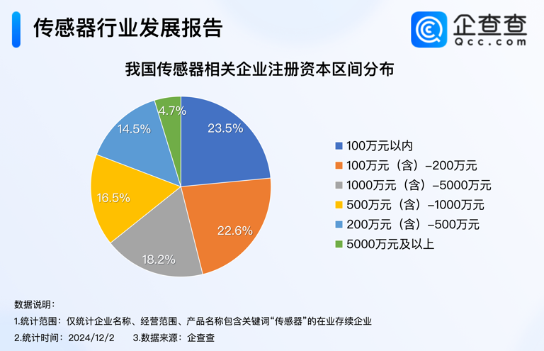 注冊(cè)資本方面,數(shù)據(jù)顯示我國(guó)傳感器相關(guān)企業(yè)以中小規(guī)模為主。其中,注冊(cè)資本在100萬(wàn)元以?xún)?nèi)的企業(yè)占比最高,達(dá)到23.5%,注冊(cè)資本在100萬(wàn)元至200萬(wàn)元之間的企業(yè)緊隨其后,占比22.6%。綜合來(lái)看,注冊(cè)資本在200萬(wàn)元以?xún)?nèi)的企業(yè)合計(jì)占比46.1%,成為主流。注冊(cè)資本在1000萬(wàn)元至5000萬(wàn)元之間的企業(yè)也占據(jù)一定比例,達(dá)到18.2%。