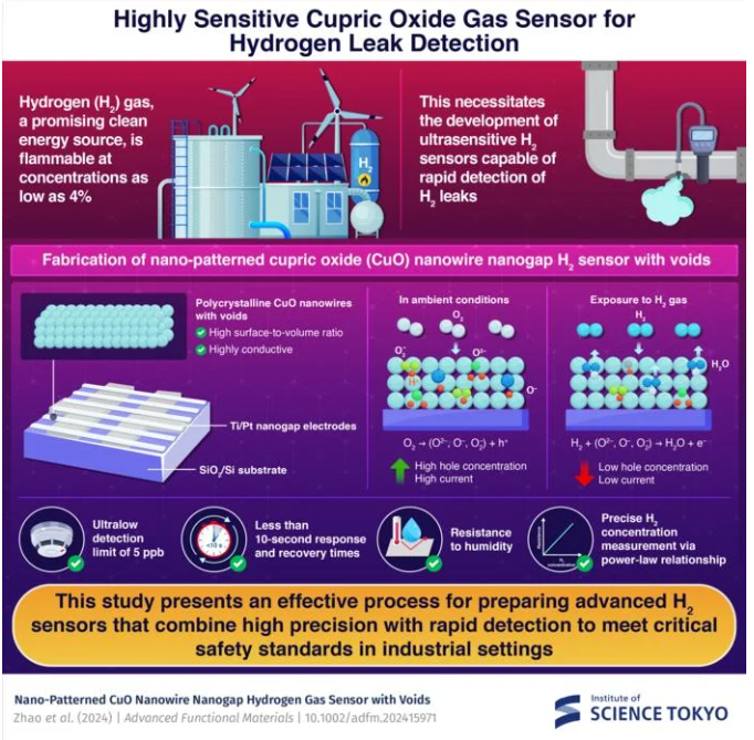 本研究提出了一種制備先進氫氣(H₂)傳感器的有效工藝,該傳感器兼具高精度與快速檢測的特點,能夠滿足工業(yè)環(huán)境中的關(guān)鍵安全標準。圖片來源:東京科學(xué)研究所