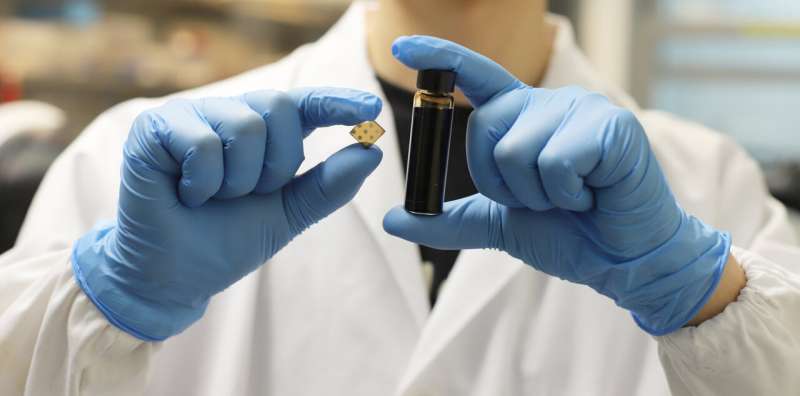左側(cè)是碲化銀(Ag₂Te)膠體量子點(diǎn)短波紅外(SWIR)光電二極管,右側(cè)是通過溶液處理的碲化銀量子點(diǎn)。圖片來源:Jordi Cortés,ICFO