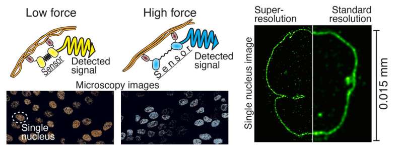 左側(cè)細胞內(nèi)力傳感器的作用原理。熒光蛋白(黃色和青色)源自水母,而類似橡皮筋的部分(黑色)利用了蜘蛛網(wǎng)蛋白。目標蛋白結(jié)合抗體(深棕色)源自羊駝。右側(cè)圖像是超分辨率顯微鏡與傳統(tǒng)顯微鏡對細胞核成像的對比。圖片來源:蒂穆・伊哈萊寧,坦佩雷大學