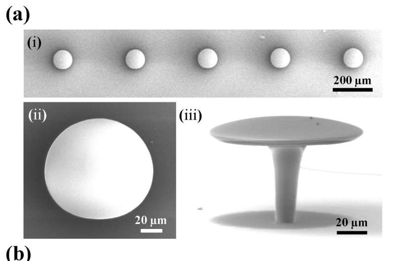 這些掃描電子顯微鏡圖像展示了不同變形程度的 3D 微打印利馬松形回音壁模式微腔:(i)微腔陣列,(ii)單個微腔的放大頂視圖,(iii)單個微腔的放大側視圖(80° 視角)。圖片來源:香港理工大學張阿平