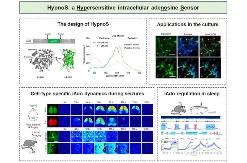 這種名為 “超靈敏細(xì)胞內(nèi)腺苷傳感器”(Hypersensitive intracellular adenosine Sensor, HypnoS)的工具,能夠在活體動物大腦中以高時(shí)空分辨率監(jiān)測癲癇發(fā)作或睡眠 - 覺醒周期中的 iAdo 動態(tài)變化。