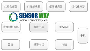 家庭監(jiān)控系統(tǒng)是一個(gè)小型的多傳感器視頻集成監(jiān)控系統(tǒng)。該系統(tǒng)利用網(wǎng)絡(luò)技術(shù)將安裝在家內(nèi)的視頻、音頻、報(bào)警器、等監(jiān)控設(shè)備和傳感器連接起來(lái),通過(guò)中控電腦或設(shè)備的處理將有用信息存儲(chǔ)、傳輸和處理,實(shí)現(xiàn)對(duì)家庭安全的全方位監(jiān)控。典型的家庭監(jiān)控系統(tǒng)構(gòu)成如下: