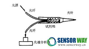 用來測(cè)定活體組織和血液值pH光纖光譜傳感器示意圖,如圖3所示。其工作原理是利用發(fā)射光、透射光的強(qiáng)度隨波長(zhǎng)的分布光譜來進(jìn)行測(cè)量。這種傳感器將兩根光纖插入可透過離子的纖維素膜盒中.膜盒內(nèi)裝有試劑,當(dāng)把針頭插入組織或血管后,體液滲入試劑,導(dǎo)致試劑吸收某種波長(zhǎng)的光.用光譜分析儀測(cè)出此種變化,即可求得血液或組織的pH值。