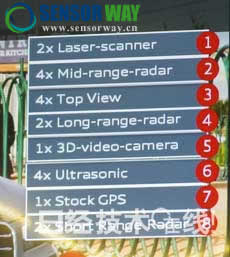 車輛的后方配置兩個(gè)近距離雷達(dá),前方和后方共配置四個(gè)中距離雷達(dá),前方配置兩個(gè)長距離雷達(dá)。攝像頭方面,前方和后視鏡部分共配備四個(gè)俯視攝像頭(Top View Camera),前車窗(Front Window)部分配備一個(gè)三維(3D)攝像頭。此外,前方和后方共配置兩個(gè)激光掃描儀,后方配置四個(gè)超聲波傳感器以及一個(gè)GPS。