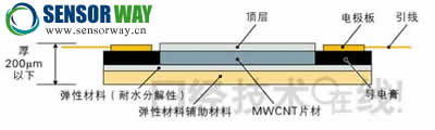 這種傳感器的開發(fā)源于鈴木到靜岡大學(xué)從事碳納米管(CNT)研究。其中重要的研究就是多層管結(jié)構(gòu)“MWCNT(multi wall CNT)”。普通CNT的長度為μm級,呈粉末狀或分散液狀態(tài),而靜岡大學(xué)開發(fā)的MWCNT長度為mm級,呈長纖維狀。MWCNT在基板上生長到足夠大以后,用鑷子等工具對其進(jìn)行拉伸,可以將MWCNT作為片材取出。